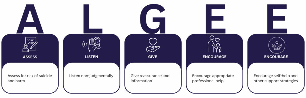 Youth and Adult Mental Health First Aid trainings teach the ALGEE method for supporting someone experiencing a mental health crisis.
